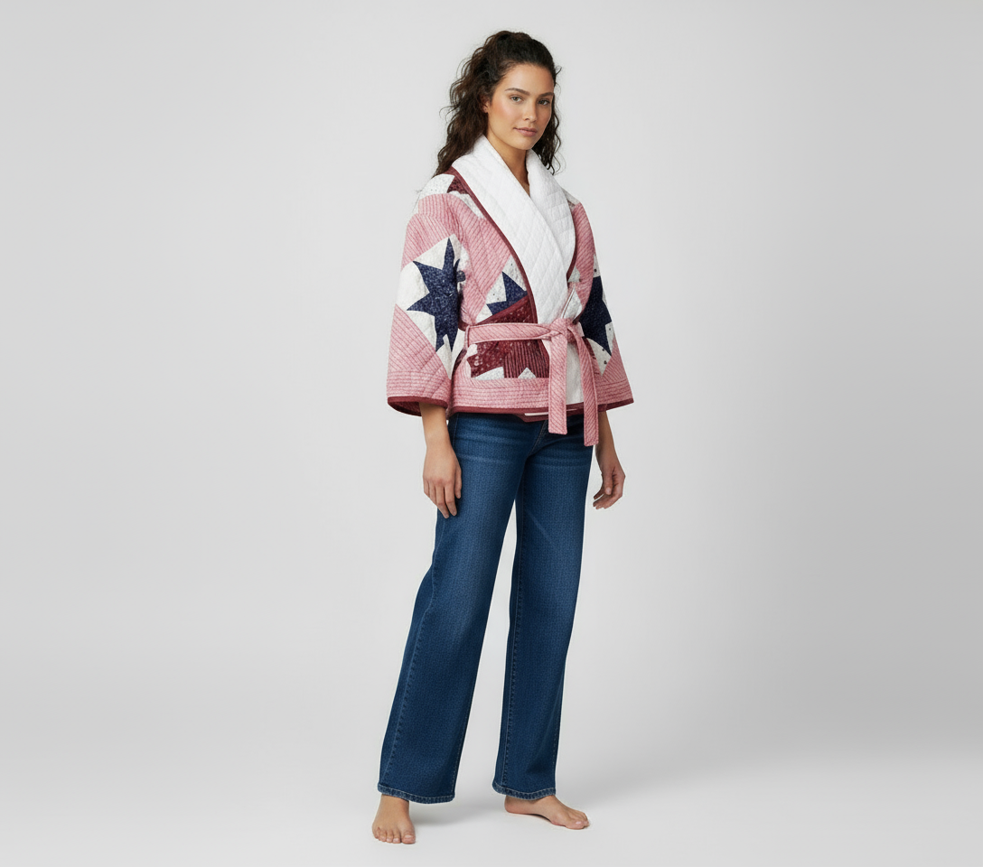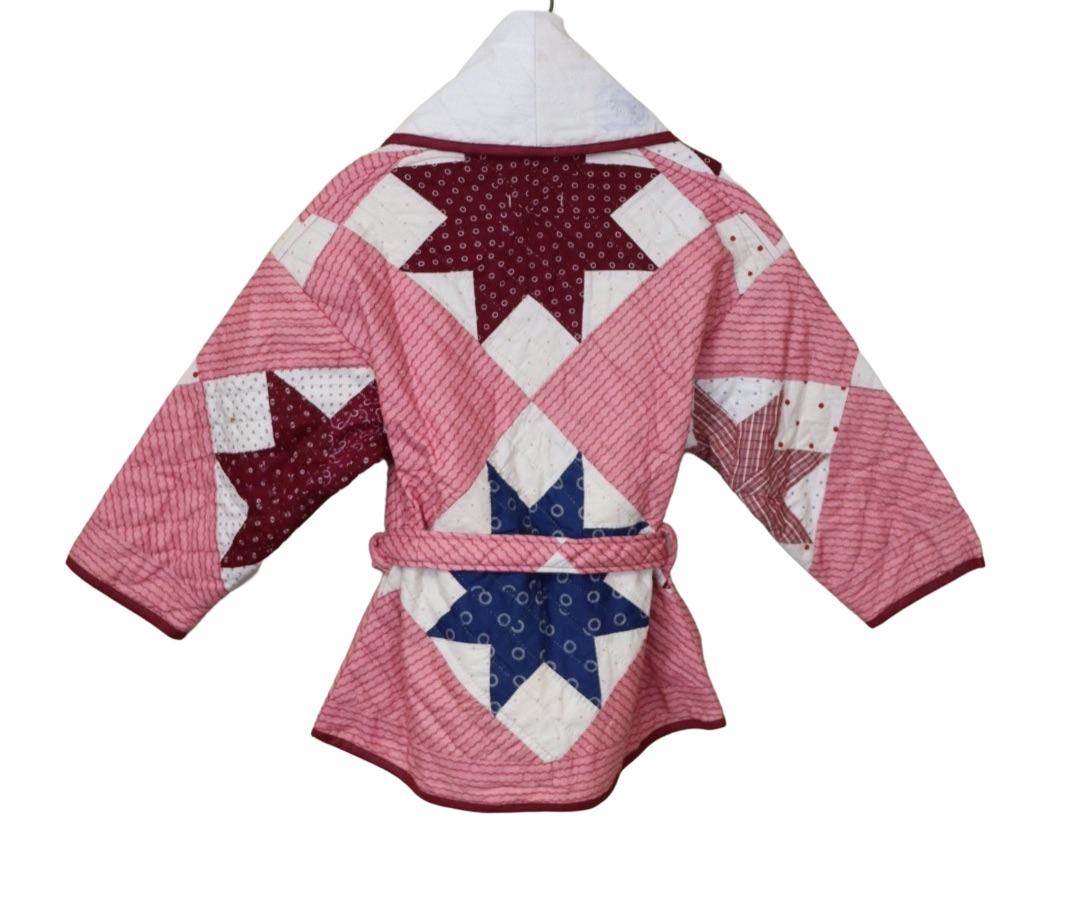 Meet Namaan. She is in our Short Easy Coat Style, with shawl collar and and dropped crop sleeves that hit right above the wrist, made from a light weight vintage quilt.