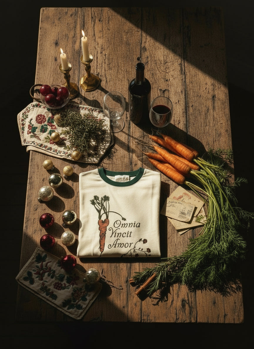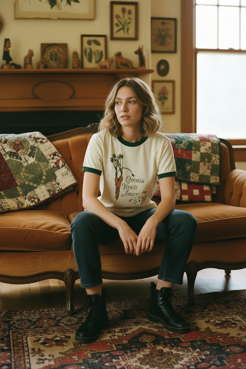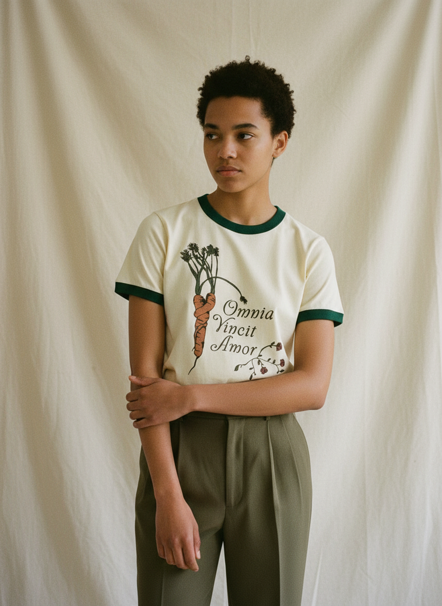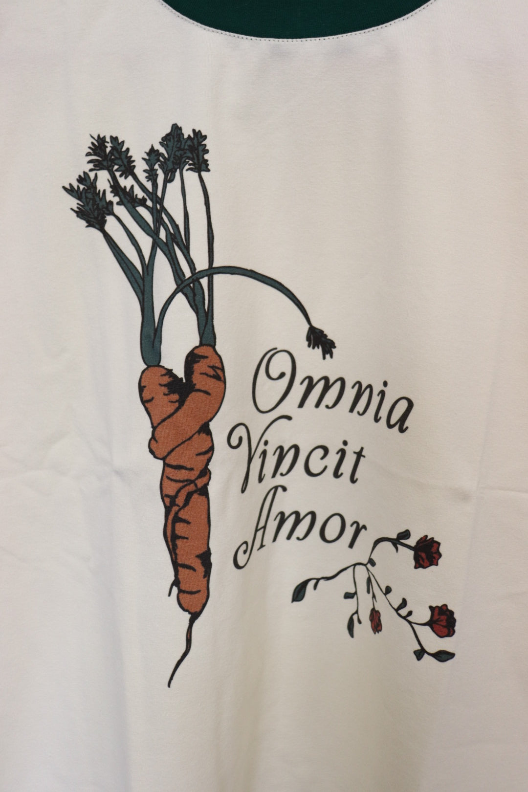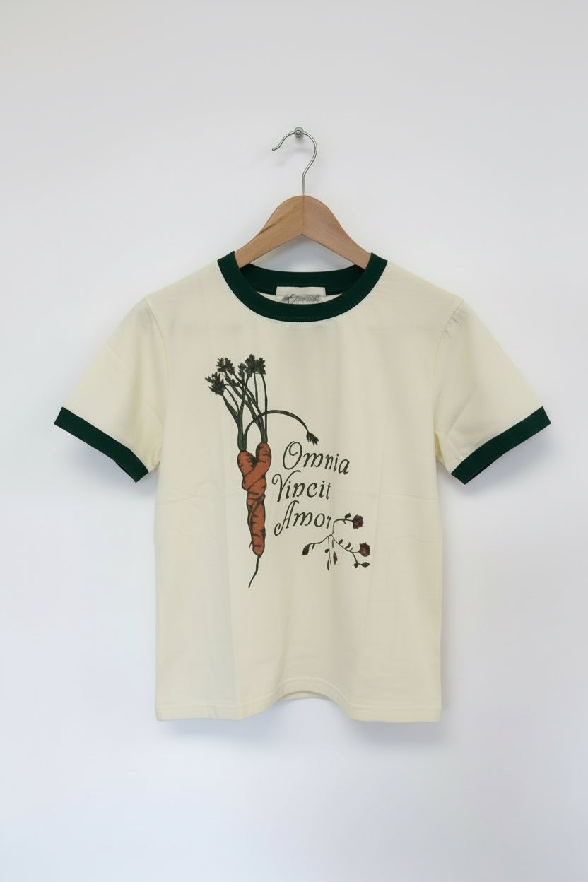 Omnia Vincit Amor. Love Conquers All! Our Carrot Lovers Tee is finally here and I couldn’t love it more. This tee is a cream tee with hunter green neck and sleeve bands. The tee is made from 95% cotton and 5% spandex. Inspired by my work at the Farm and harvesting carrots (some of which are Lovers Carrots 🥰). Also inspired by the only class I’ve ever failed (not once but yes twice) Latin 202. And lastly inspired by my belief that if we all do our very best to greet each day and person with love and kindness we can make the world a truly better and beautiful place. 🥕🥕